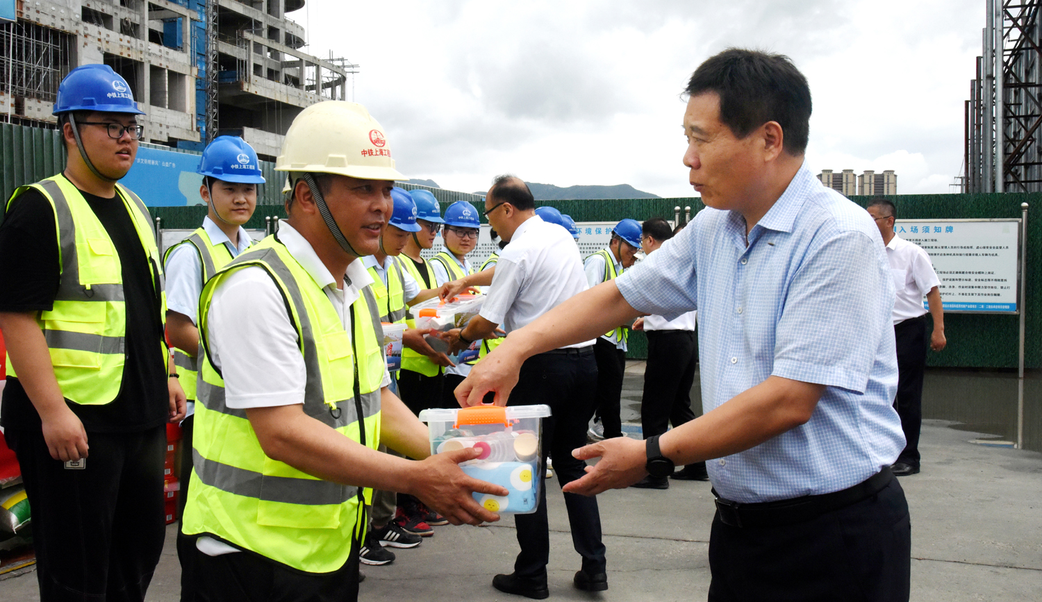 728日,市總工會(huì)黨組書記、副主席丁維杰帶領(lǐng)市總工會(huì)相關(guān)部門負(fù)責(zé)人一行,在集團(tuán)公司黨委副書記、工會(huì)主席戴鴻鳴的陪同下,看望慰問奮戰(zhàn)在市重大項(xiàng)目一線的建設(shè)者,并送上防暑急救箱等慰問品。