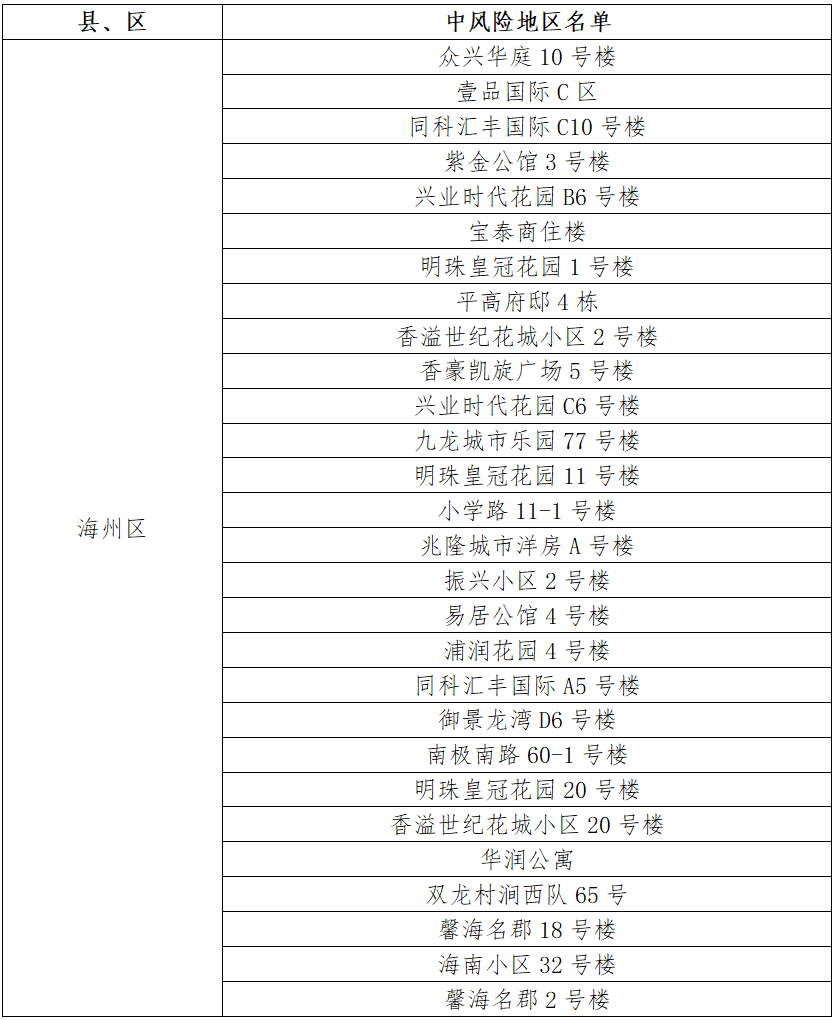 根據國務院聯防聯控機制有關規定,經市指揮部研究決定,自發布之日起,對我市部分區域疫情風險等級進行調整:海州區天順國際花園7號樓、鳳凰名都10號樓、御景龍灣C1號樓、天順國際花園11號樓、御景龍灣A4號樓、香溢江南小區12號樓、同科匯豐國際A2號樓、平高書香名邸1號樓、香溢江南小區7號樓、西門村楊鳳莊21號、鳳凰名都9號樓、園林村白虎山小區78號樓、江化北路82-5號、金色大漠、平高書香名邸4號樓、朐陽街道花園路1號、制藥巷5-114、萬潤泰和苑4號樓由中風險地區調整為低風險地區。其他地區風險等級不變。調整后全市現有28個中風險地區。