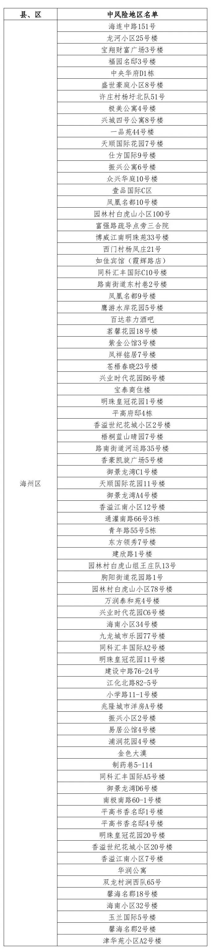 根據國務院聯防聯控機制有關規定,經市指揮部研究決定,自發布之日起,對我市部分區域疫情風險等級進行調整:海州區眾興華庭7號樓、悅城國際9號樓、香溢世紀花城小區7號樓、許莊村楊圩北隊75號、極美苑2號樓、頤和花園1號樓、麻紡小區10號樓、銀城公寓1號樓、新建西路30號樓、仕方國際10號樓、吾悅華府9號樓由中風險地區調整為低風險地區。其他地區風險等級不變。調整后全市現有79個中風險地區。