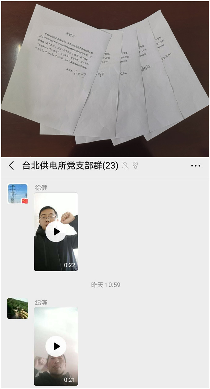 為充分貫徹落實黨中央關于打贏疫情防控阻擊戰的重要指示精神。2月13日,臺北供電所黨支部開展了“防控疫情,我們在行動”主題黨日活動。該支部以“我是黨員我宣誓”、“疫情防控我承諾”、“我為疫情防控獻一策”系列活動,充分利用網絡直播平臺和微信APP,通過錄制個人宣誓短視頻、承諾書簽字、集體線上學習等方式方法,號召廣大黨員同志充分發揮黨員先鋒模范作用,在抗擊疫情的關鍵時刻,必須服從命令、聽從指揮;堅守崗位、恪盡職守;堅定信心、沖鋒在前;不忘初心,牢記使命;堅決打贏疫情防控阻擊戰。(錢明華)