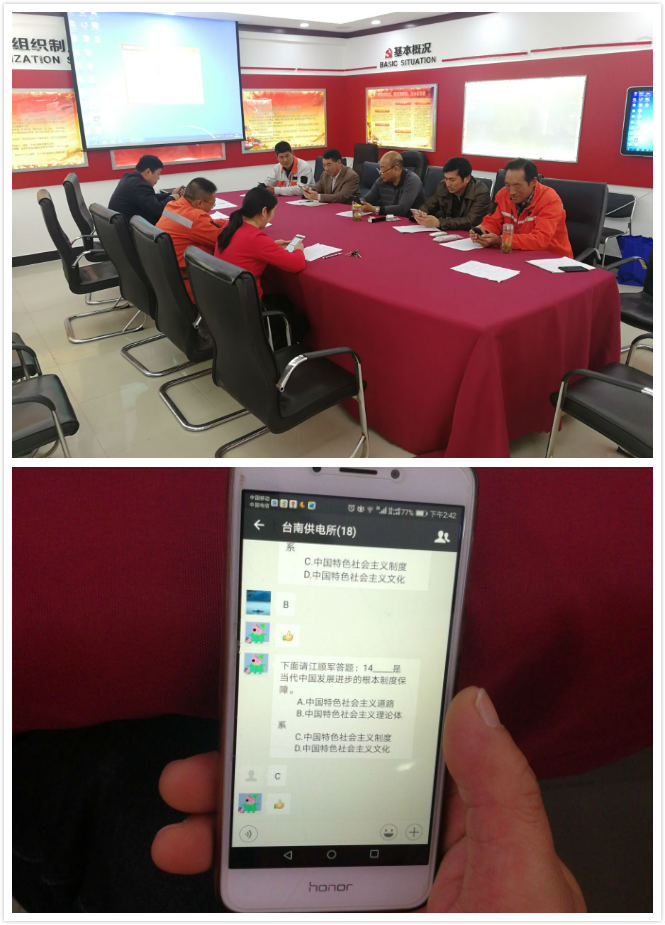 4月10日下午,臺南供電所全體黨員靜坐在會議桌旁,每人拿著一部手機,進行著一場特殊的考試。近年來,該所黨支部積極響應公司黨委創新黨員教育管理舉措,利用微信公眾平臺,開展“掌上黨課”和“指尖上廉政教育”活動,學習黨的十九大精神,進行黨紀黨規知識測試,實現隨時、隨地、隨身,提升了學習教育成效。(劉繼美)
