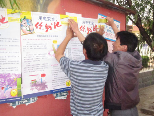 (圖為職工在社區(qū)張貼安全用電知識)
