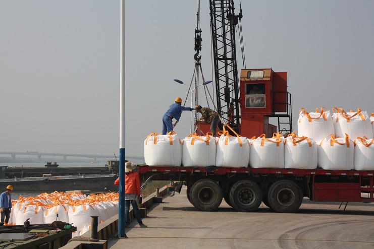 10月6日上午9時許,隨著一聲汽車長笛,一輛載有近40噸化工物資的卡車徐徐??吭谙笪锪鞴疚骞嗪哟a頭邊,緊接著碼頭鐵臂起舞,機械操作工宋成龍、楊棟梁嫻熟地操縱著塔吊機械,王緒銀、駱公友等職工敏捷地指揮吊臂準確地將一包包噸貸物資裝卸在碼頭邊的貨船中。。。。。。自此,一輛輛滿載噸袋物資的卡車便不停地駛進碼頭。