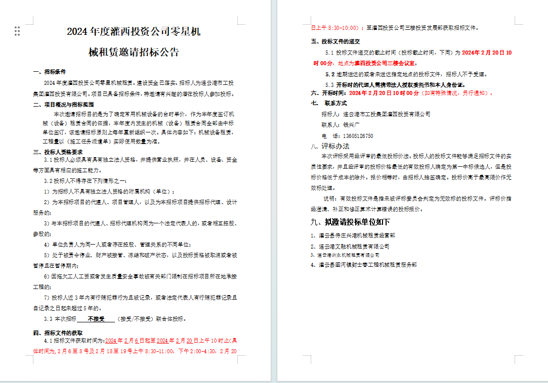 2024年度灌西投資公司零星機 械租賃邀請招標(biāo)公告