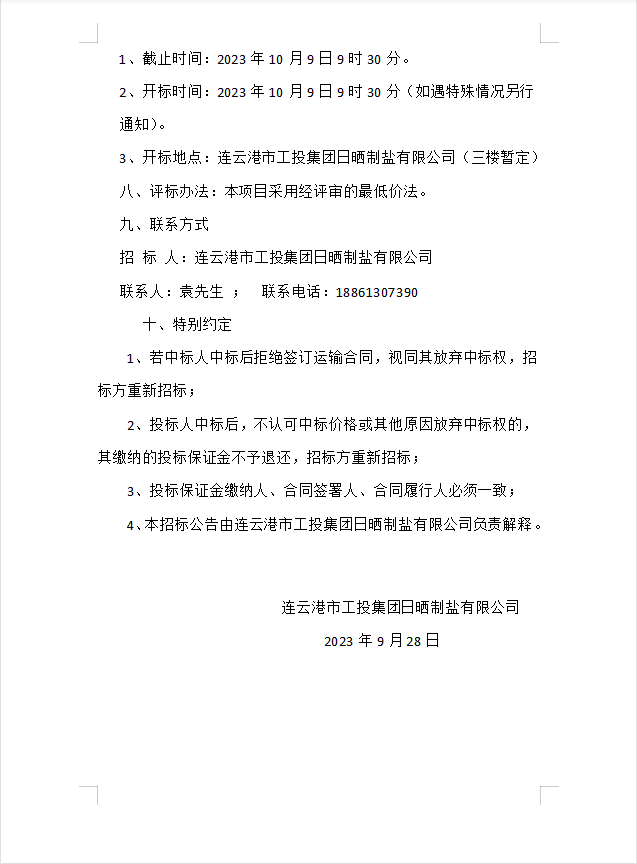 連云港市工投集團日曬制鹽有限公司海運物流服務業務招標公告