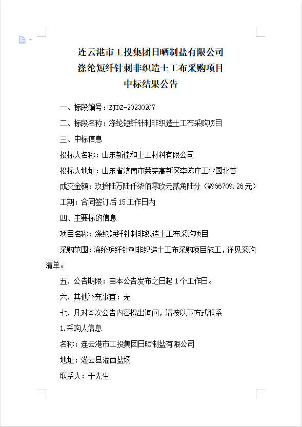 連云港市工投集團日曬制鹽有限公司滌綸短纖針刺非織造土工布采購項目中標結果公告