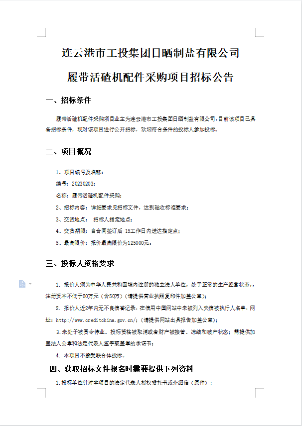 連云港市工投集團(tuán)日曬制鹽有限公司履帶活碴機(jī)配件采購(gòu)項(xiàng)目招標(biāo)公告