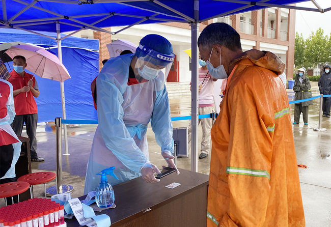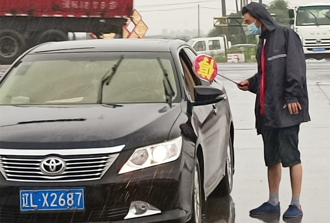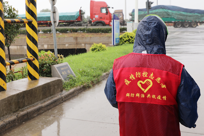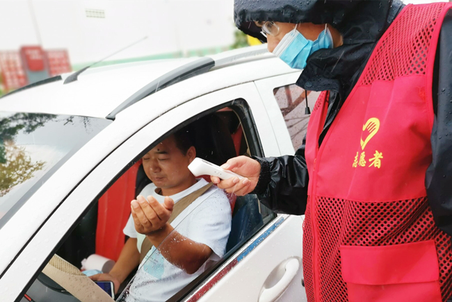 “您好,請出示一下行程碼,做下登記?!眻允卦趰徫唬骘L迎雨,對車輛進行逐一登記和體溫檢查,絲毫沒有受天氣的影響。
