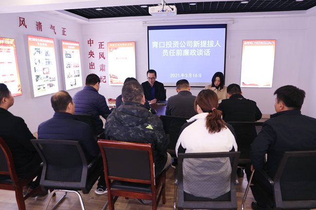 ? ?3月16日下午,青口投資公司紀委書記朱文兵對九名新提拔人員進行任前集體談話,相關人員參加了此次會議。? ? ? ? ? ? ? ? ?