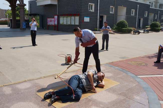 ? ? ? ? ?本次演練模擬一名物業(yè)維修人員施工不慎碰到裸露的電線,導致觸電倒地。在演練現(xiàn)場,專業(yè)電工、醫(yī)護人員先向觀摩人員詳細講解了觸電急救、人工呼吸及胸外心臟擠壓等救援理論知識,并進行施救演示。經(jīng)過 20多分鐘的演練,順利完成了演練任務。演練結束后,安全技術部負責人對演練情況進行綜合點評,并對泰祥員工安全知識進行培訓,泰祥公司現(xiàn)場發(fā)放了安全用電小常識等宣傳材料。通過此次演練使員工對觸電事故的應急救援步驟和方法有了更深的認識,進一步提高職工觸電急救的能力,有效地提高了職工防范安全風險的意識。
