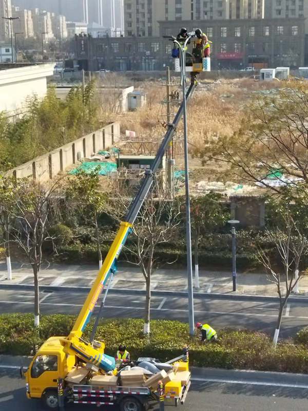 ?該項城市照明提升工程工程量大(約6500套路燈),工期緊。為了趕時間進度,翔立“鐵軍”們由12月27開始施工,日以繼夜、馬不停蹄的連續奮戰在工程一線,沒有一個人掉隊,沒人喊苦叫累,個個都像鉚足了勁的“小牯牛”。肩帶《安全員》紅袖章的工程負責人喬以成騎著電瓶車不時地在海寧大道上來回穿梭著,“王師傅,高空作業車四條支撐臂必須支撐平穩牢固后再提升哦”,“段青春,把前方施工的警示牌擺在車輛后面,還有道路安全錐桶一定要將作業區域圍起來,與后面來車方向保持安全距離。”在市區人流密集的道路上同時有5臺登高作業車分區域高空作業的情況下,他最放心不下,畢竟是高空作業!為了防止高空墜落,登高施工操作人員全部按要求規范佩戴安全帶、系好安全繩、絕緣鞋、防寒安全帽、警示馬甲一應俱全,武裝整齊。為防高空落物,作業車吊籃內使用的工具全部系上“失手繩”,安全施工是必要的前提,有措施,有辦法,畢竟千條萬條,安全才是第一條!