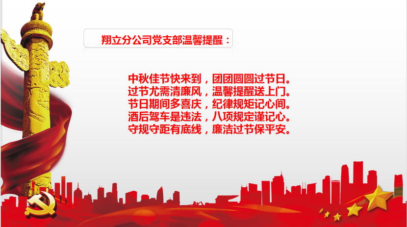 ? ? 為筑牢廉政“防火墻”,確保佳節期間風清氣正,95日,翔立分公司黨支部通過微信向全體黨員干部職工發送廉潔小短信,提醒全體職工拒腐戒奢,廉潔過節。