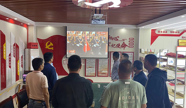 主題黨日活動在國歌中拉開了序幕。資產(chǎn)管理中心全體黨員列隊(duì)面向屏幕,觀看天安門廣場升國旗儀式視頻。