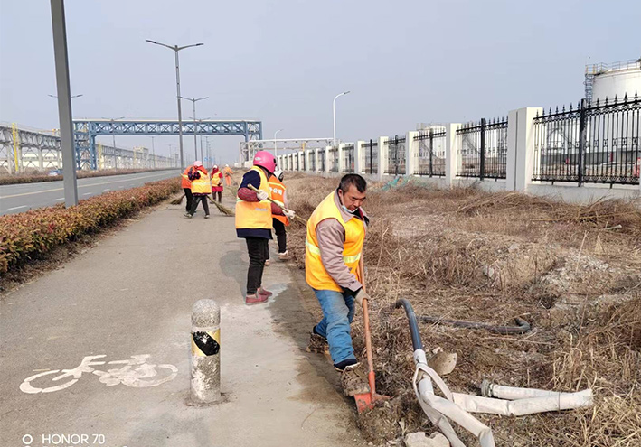 該分公司注重細節,不斷強化突擊治理成效,第一時間策劃保潔方案。園區兩個班組35名保潔員工在公司統一指揮下,步調一致,無懼三九嚴寒低溫天氣,兩人一對,三人一組,舞動掃把,清掃輔道泥土雜草;勞動現場,黨員先鋒無處不在,石峰、朱海勇、楊靜等同志,身背幾十斤重打草機械,盡管汗水浸濕橙色衣衫,累得腰酸背痛,無所怨言,仍然擺動雙臂,經過近三天的努力奮戰,收割石化三道、十道、復堆河路牙,輔道雜草3000多米長,清理管廊、取水點隱藏各類白色垃圾400多包,轉運20余車,人工清掃路面2000多米長。