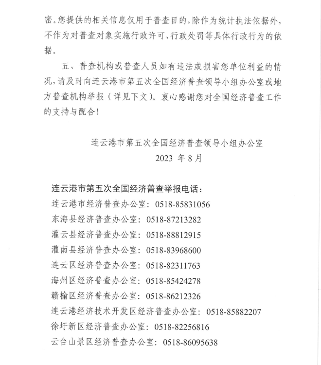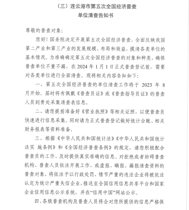 按照《全國經(jīng)濟普查條例》規(guī)定,國務(wù)院決定于2023年開展第五次全國經(jīng)濟普查,為提高經(jīng)濟普查質(zhì)量,進一步推進普查工作順利開展,公司按照上級第五次全國經(jīng)濟普查宣傳動員工作要求,現(xiàn)將《連云港市第五次全國經(jīng)濟普查單位告知書》公示如下: